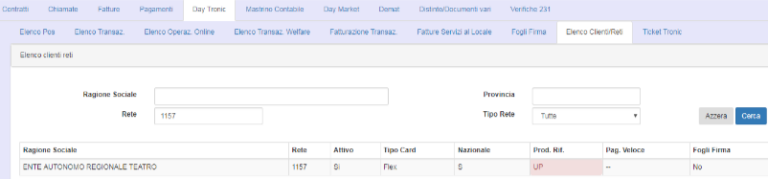 Per verificare una rete sul POS dell’Affiliato, cerca per Codice Rete o Ragione Sociale.