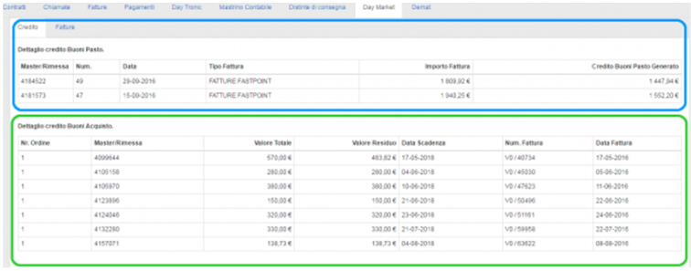 In questa sezione trovi l’analisi del Credito AZIENDA1 Market in “Dettaglio credito Buoni pasto” e “Dettaglio crediti Buoni Acquisto”.