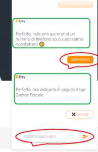 - L’assistente virtuale richiede all’utilizzatore il numero di telefono e il codice fiscale in modo da recuperare tutti i dati sul crm