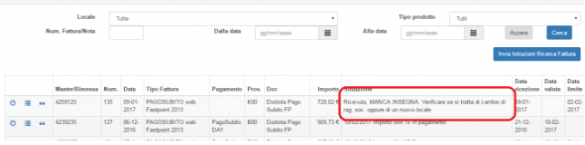La situazione “Manca insegna” indica che l’indirizzo nella fattura inviata non corrisponde a nessuna insegna nel sistema.