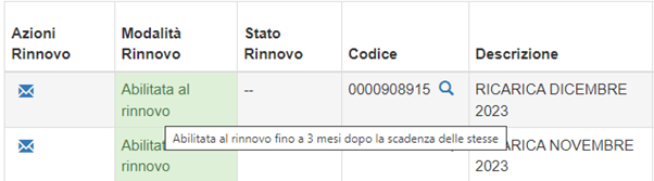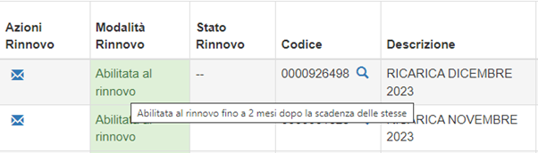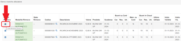 - Cliccare su [Rinnova ricarica] e si attiva il processo automatico di generazione di una nuova ricarica con scadenza al 31 Dicembre dell’anno successivo.