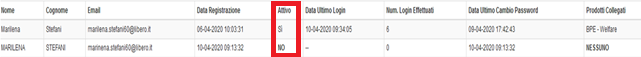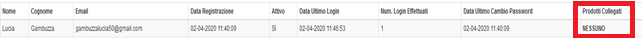 Se la colonna “Attivo” è compilata con “Si” e la colonna “Prodotti collegati” è compilata con “Nessuno”, il cliente si è registrato correttamente al portale ma non ha associato nessun prodotto.